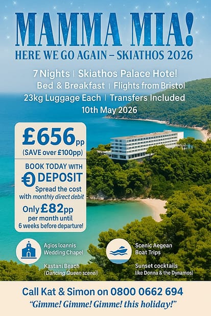 🎤🌴 MAMMA MIA! HERE WE GO AGAIN – SKIATHOS 2026 – ZERO DEPOSIT🌴🎤