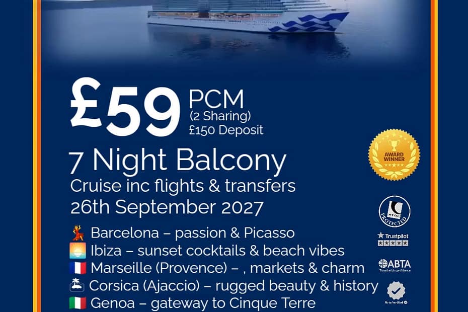 Experience an unforgettable 7-night balcony cruise including flights and transfers for just £59 PCM (2 sharing) with a £150 deposit. Explore Barcelona, Ibiza, Marseille, Corsica, Genoa, La Spezia, and Rome. Flexible payment plans available for Inside, Oceanview, and Balcony cabins. Book now by calling 0800 0662 694. #CruiseDeals #EuropeTravel #HolidayPlanning