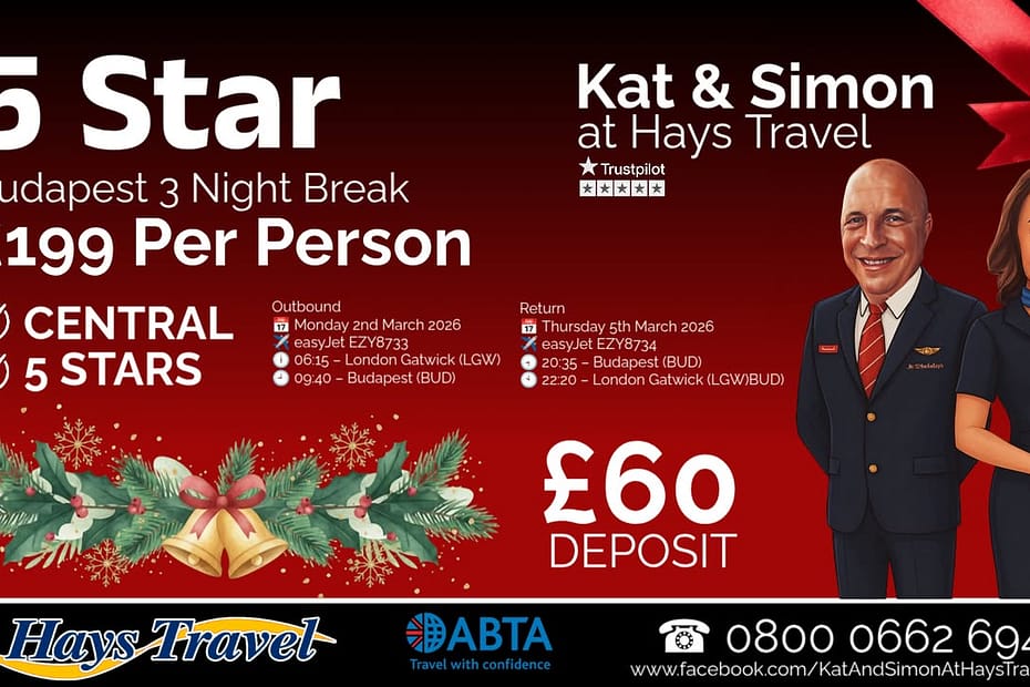 Discover a 5-star 3 night break in central Budapest for just £199 per person with Kat & Simon at Hays Travel. Fly easyJet from London Gatwick on 2nd March 2026, returning 5th March. Secure your trip now with a £60 deposit. Call 0800 0662 694 or visit our Facebook page to book today. #BudapestBreak #TravelDeals #HaysTravel