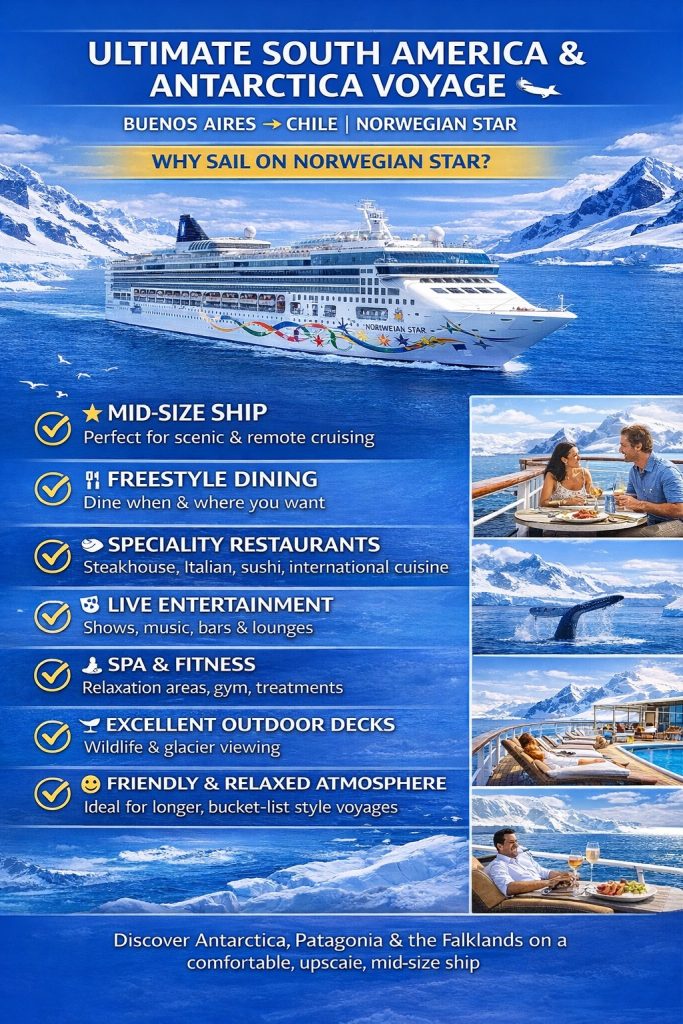 Join us on an extraordinary 15-night South America & Antarctica cruise aboard Norwegian Star — combining iconic cities, remote islands, glaciers, icebergs and penguins 🐧🧊
