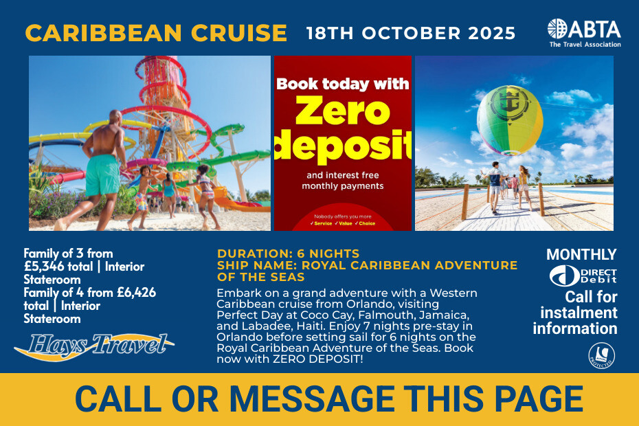 🤩 Big Adventure, ZERO Deposit! 🤩 ✨ Treat the Whole Family to Orlando With Western Caribbean Cruise! ✨ 🌴 7 Nights pre-stay 3* Rosen Inn Closest to Universal 🌴 6 Nights onboard Royal Caribbean Adventure of the Seas, Full Board 🌴 18th October 2025 🌴 Flying from London Heathrow 🌴 Private overseas transfers included ⚓ Cruise itinerary: Orlando > Perfect Day at Coco Cay > Falmouth, Jamaica > Labadee, Haiti > Orlando 🛳️ Book today for ZERO DEPOSIT 🛳️ Followed by 6 monthly payments of £891 per family 🛳️ Family of 3 from £5,346 total | Interior Stateroom 🛳️ Book today for ZERO DEPOSIT 🛳️ Followed by 6 monthly payments of £1,071 per family 🛳️ Family of 4 from £6,426 total | Interior Stateroom 🌊 Your next family adventure awaits – DON’T MISS OUT! 🌊 ✉️ Send a direct message to our friendly team today! We can also check alternative dates & airports! *T&Cs Apply