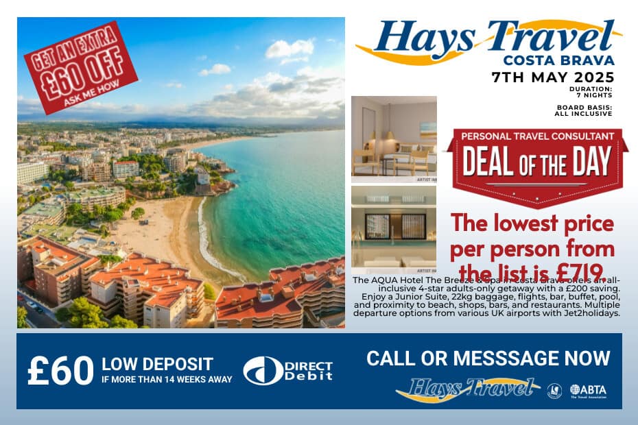 😍 Adults only getaway to Costa Brava from £719pp 😍 AQUA Hotel The Breeze & Spa📍 All Inclusive, 4 stars ⭐ Departing on 7th May 2025, 7 nights Price based on 2 adults INCLUDES A £200 SAVING What’s included? 🛏 Junior Suite 🧳 22kg baggage & 10kg hand luggage ✈️ Return flights to Girona 🍹 Bar & buffet restaurant 👙 Outdoor pool 🌊 150m from the nearest beach 🏛️ 50m from the nearest shops, bars and restaurants Hotel facilities: 🏊♂️ Swimming pool 🧖♀️ Spa & Wellness center 🏋️♀️ Fitness center 🍹 Poolside bar 🍽️ Fine dining restaurant 💆♀️ Beauty salon ✈️ London Stansted from £719pp (departs 7th May) ✈️ Bournemouth from £729pp (departs 25th April) ✈️ Bristol from £729pp (departs 3rd May) ✈️ Leeds Bradford from £749pp (departs 20th April) ✈️ Manchester from £759pp (departs 21st April) ✈️ Newcastle from £789pp (departs 27th April) ✈️ East Midlands from £819pp (departs 4th May) ✈️ Glasgow from £849pp (departs 18th May) Proud to offer Package Holidays You Can Trust ❤ Book today 📞 *T&Cs apply. Subject to availability and correct as of 10th February 2025. Price is based on 2 adults.