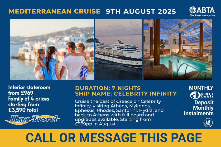 π¬π· Tick Santorini, Mykonos & MORE off your Bucket List THIS August! π¬π· Experience the Best of Greece from ONLY Β£969pp! β¨ β 7 Nights, Full Board β Sailing on Celebrity Infinity β 9th August 2025 β Flying from London Gatwick π Cruise itinerary: Athens (Piraeus) > Mykonos > Ephesus (Kusadasi) > Rhodes > Santorini > Hydra > Athens (Piraeus) β¨ Upgrade to ‘All Included’ for ONLY Β£65pp per night and receive unlimited classic drinks and wi-fi β¨ π Up to 35% off 1st & 2nd guest PLUS up to Β£500 bonus savings included! π€© Book today with Β£150pp deposit π€© Followed by 4 monthly payments of Β£204.75pp π€© Interior stateroom from Β£969pp β Family of 4 prices starting from Β£3,590 total Don’t miss out on this incredible Greek adventure! ππ’π΄πΉπ°π