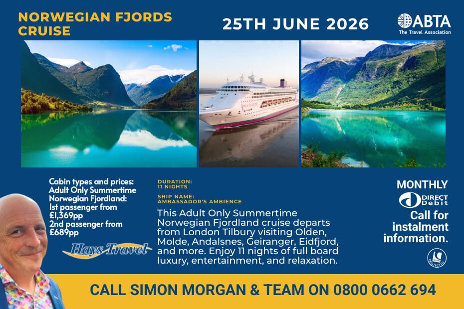 🌊✨ Dive into an Adult Only Summertime Norwegian Fjordland Adventure! ✨🚢 😍 Indulge in a Buy One, Get One Half Price offer – Book by 12th February 2025! 📅 11 Nights, Full Board 🚢 Set sail on the luxurious Ambassador’s Ambience 🚢 Departing on 25th June 2026 from London Tilbury 🗺️ Cruise Itinerary: London Tilbury > Olden > Nordfjord > Molde > Andalsnes > Romsdalsfjord > Geiranger > Geirangerfjord > Eidfjord > Hardangerfjord > Lysefjord > London Tilbury ✨ Enjoy 20% off drinks Package with Ambassador Fare ✨ All port taxes, fees and charges included ✨ Fitness, dance, and wellness classes ✨ Stellar entertainment and Captain’s cocktail party 💰 1st passenger from £1,369pp 💰 2nd passenger from £689pp Seize this incredible opportunity for a getaway of a lifetime! 📞 Call us on 0800 098 3587 📧 Reach out to our team today!